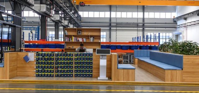 海佳現(xiàn)代化智能總裝車間是國際著名設(shè)計(jì)公司為海佳機(jī)械定制設(shè)計(jì)的全球首個(gè)織機(jī)脈動(dòng)式裝配生產(chǎn)線體。整個(gè)總裝車間由平臺(tái)安裝區(qū)、脈動(dòng)線組裝區(qū)、模組組裝區(qū)、試機(jī)平臺(tái)區(qū)四個(gè)部分組成。整個(gè)裝配過程的物料運(yùn)轉(zhuǎn)和配送,全部由AGV和RGV系統(tǒng)自動(dòng)調(diào)度,整條線體除了整機(jī)裝配外,全部實(shí)現(xiàn)自動(dòng)化生產(chǎn)。目前線體承擔(dān)的是海佳噴水織機(jī)和噴氣織機(jī)的裝配,單班每天的產(chǎn)量在21-22臺(tái)。
