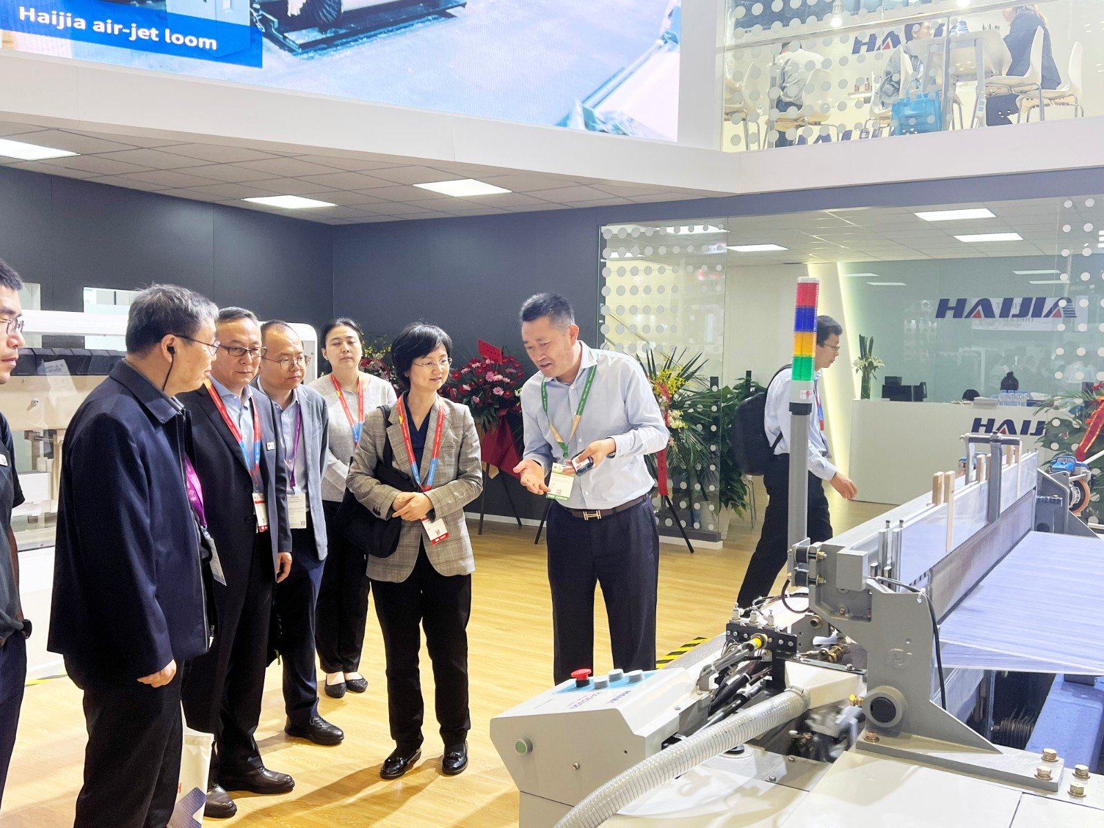 工業(yè)和信息化部消費品工業(yè)司副司長鄭艷一行領(lǐng)導(dǎo)參觀海佳展位,董事長王安儉重點介紹了海佳噴氣織機(jī)創(chuàng)新賣點。